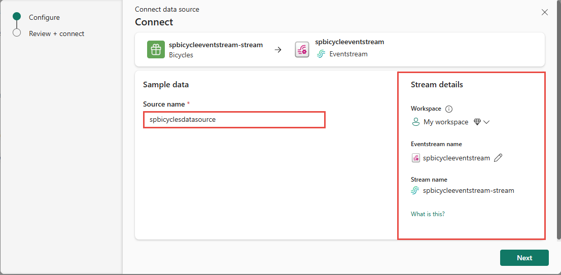 On the Review + connect page, if you select Open eventstream, the wizard opens the eventstream that it created for you with the selected sample data source. To close the wizard, select Finish at the bottom of the page.