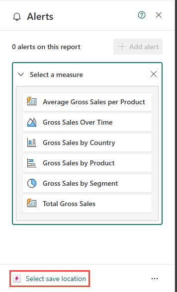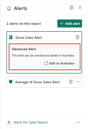 In the Alerts pane, select +Add alert to get back to see all the measures associated with the report. Also, notice that the activator item you created in the previous step shows up at the bottom of the Alerts pane.