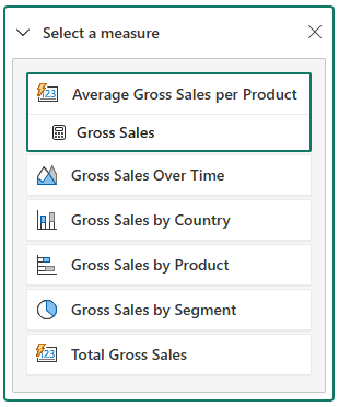 In the following example, Average Gross Sales per Product is selected.