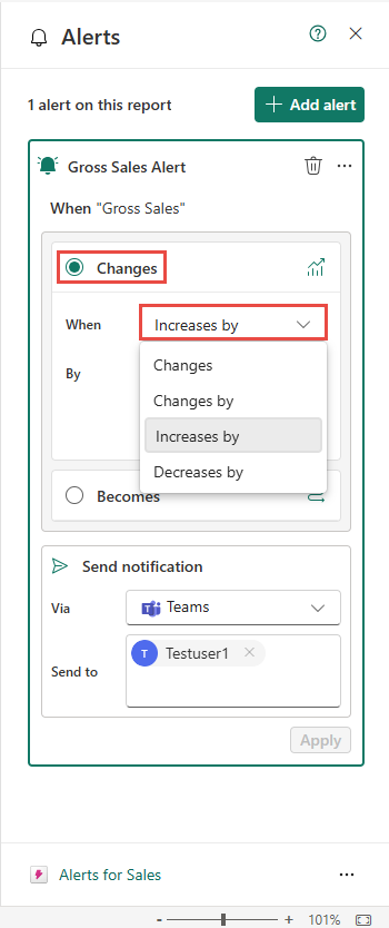In this example, you created an alert on the Gross Sales measure so that a Teams notification is sent to Testuser1 when the value increases by 10%.