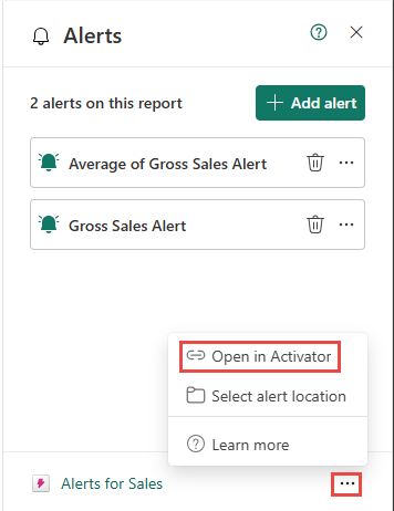 To open the Activator item, at the bottom of the Alerts window, select ellipsis (...), and then select Open in Activator.