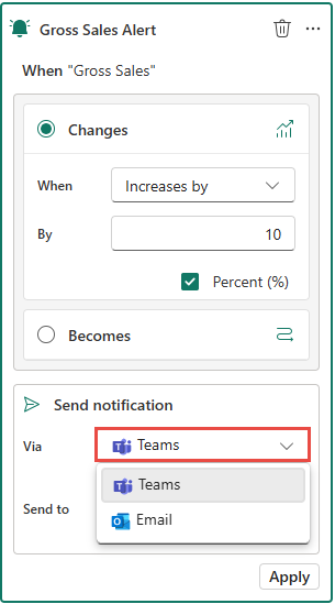 After you select the measure, you see the same user interface as you did when you set up the first alert. Follow the same steps to define a condition (select Changes or Becomes) and an action (send notification) for the second alert. Then, select Apply. Here's an example: