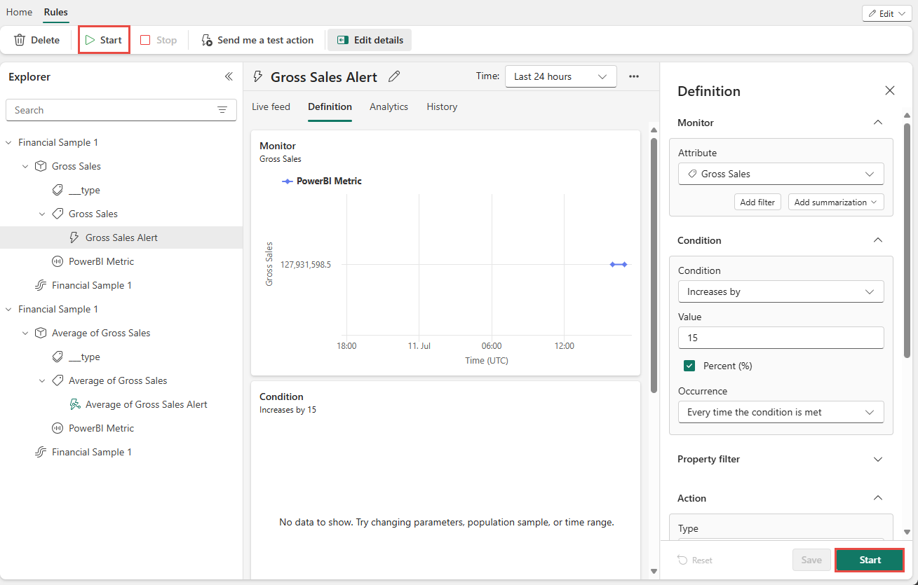 If you save the alert without starting, you can start the alert using the Start button in the same window (Definition), or Start button on the ribbon.