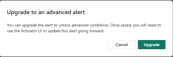 In the Definition window to the right, make any changes you want. In this example, the value is increased from 10% to 15%. As soon as you modify, you get the following message to confirm whether you want to upgrade to an advanced alert that you can edit only the Activator user interface from now onwards. If you upgrade, you can't edit this rule in the Power BI report user interface anymore.