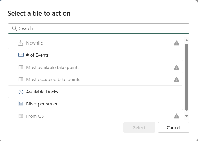 2. In the popup window, choose the tile you want to monitor and then select Select to open the side pane. Screenshot of the popup window with the list of tiles to create an Activator rule.