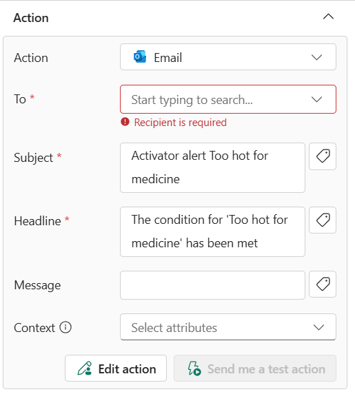 2. Optionally, send a test message by selecting Send me a test action. First check that you're the Recipient.