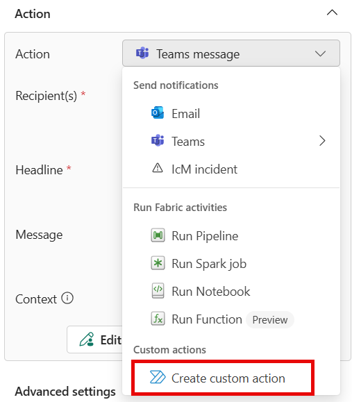 4. Custom actions: To configure the alert to call a custom action when the condition is met, follow these steps: