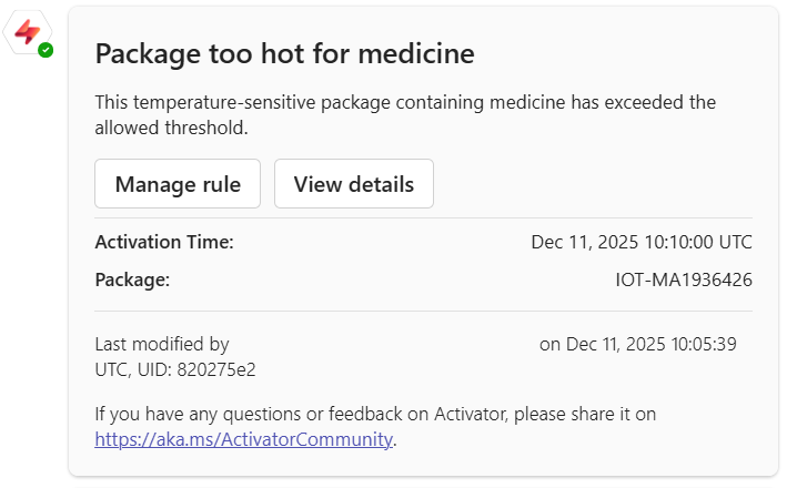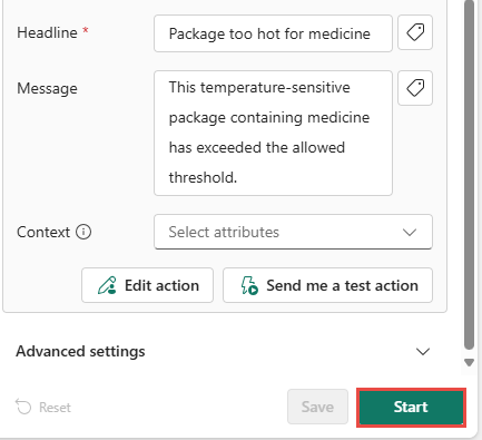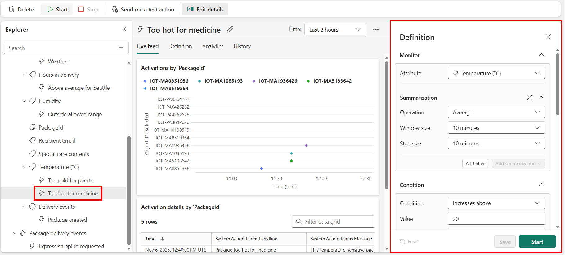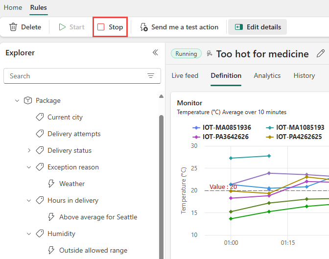 4. Select Start. This causes the rule to become active. You receive a Teams message whenever a medicine package is too hot. The rule should trigger several times every hour.