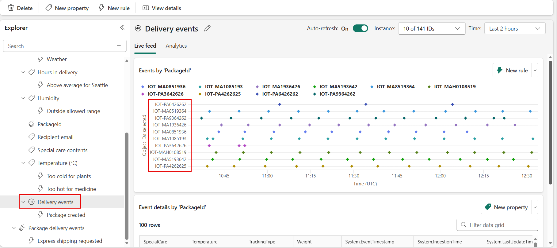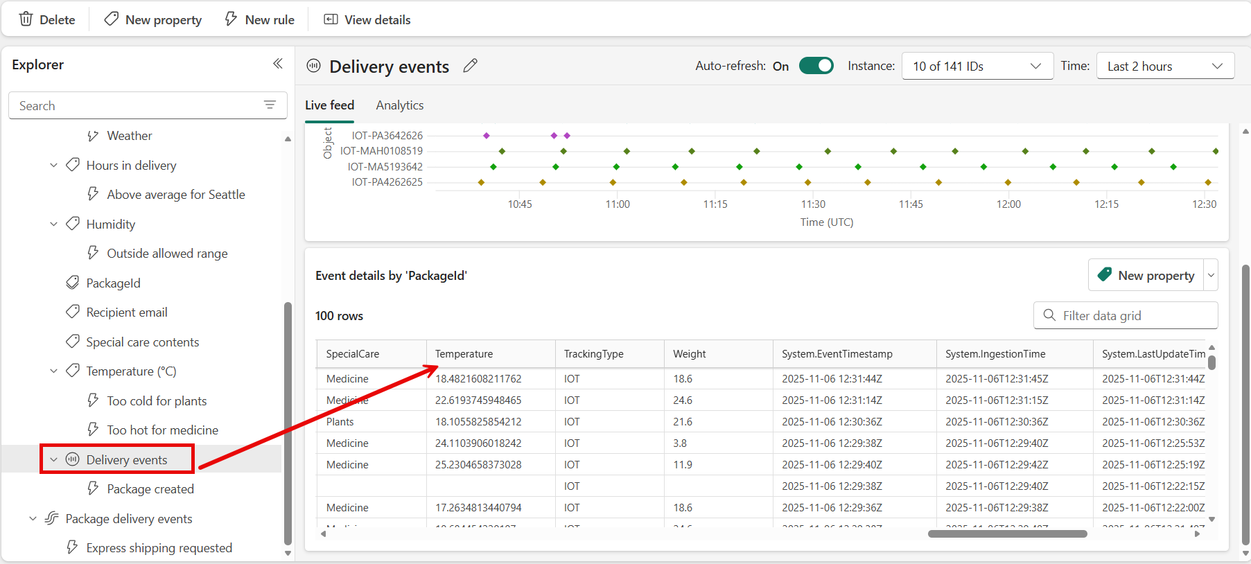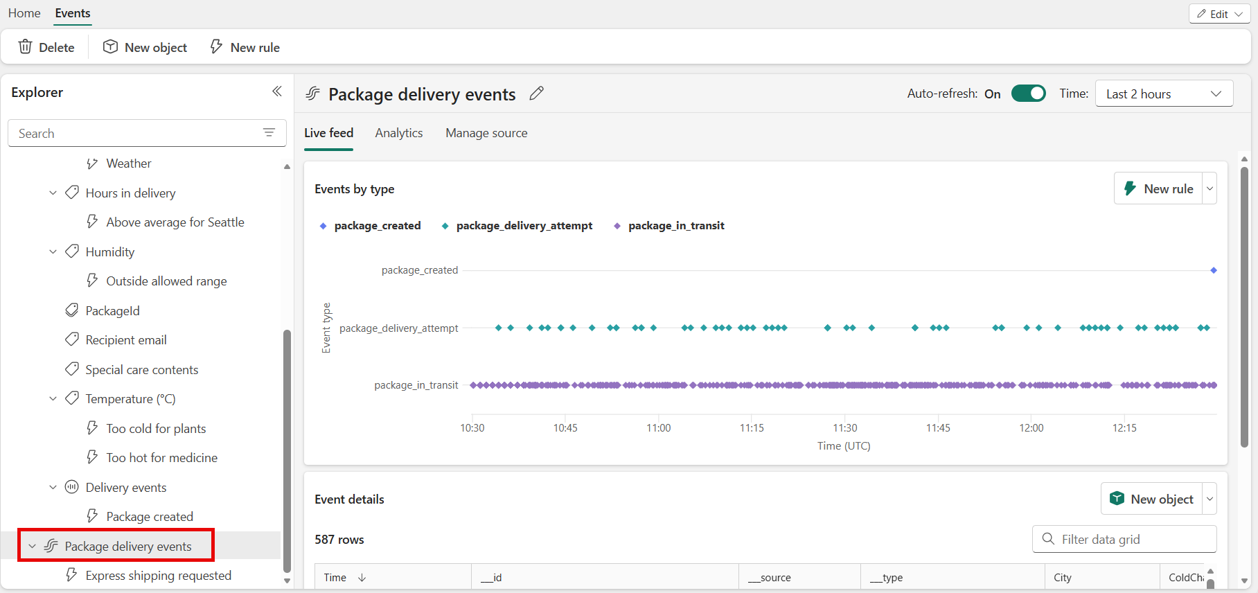1. In the Explorer pane, select the object called Delivery events. You can create rules about objects that use data from the Package delivery events eventstream. For example, a rule that checks packages for temperature.
