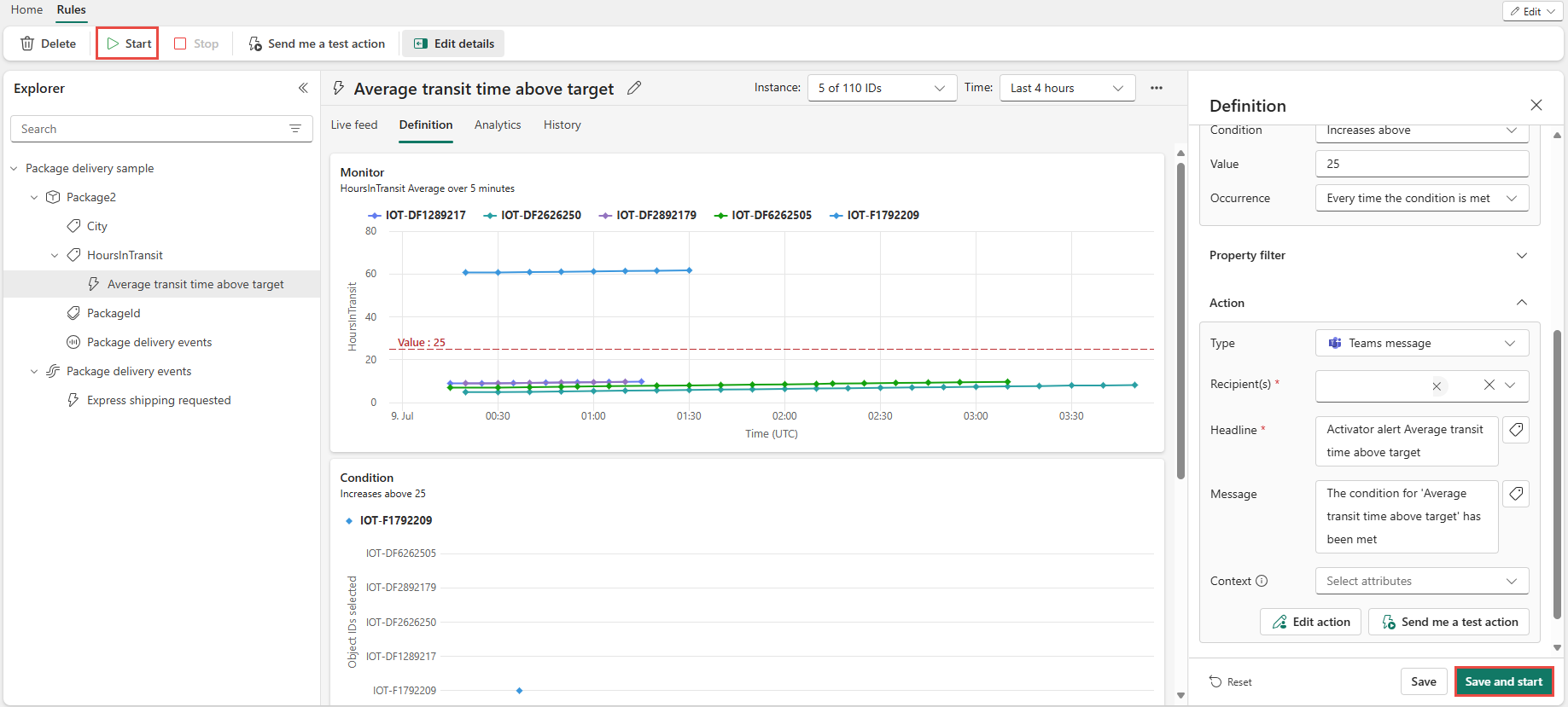 8. Start your rule by selecting Save and start in the Definition pane or by selecting Start on the ribbon.