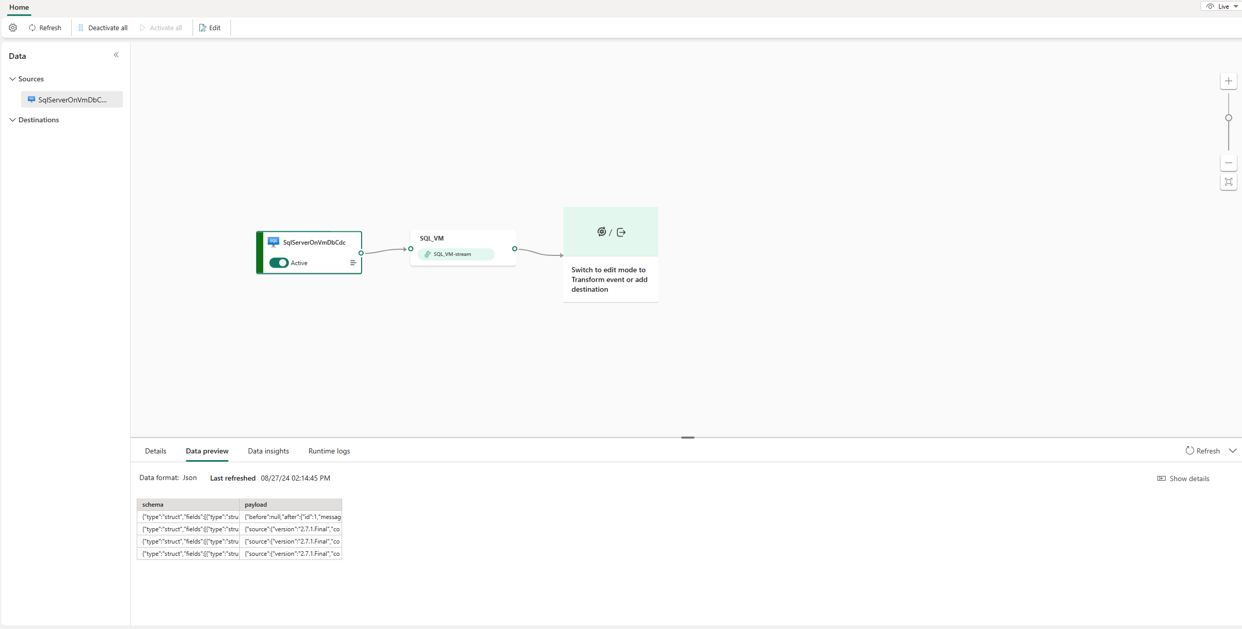 A screenshot of the added SQL Server on VM DB CDC source in Live view mode.