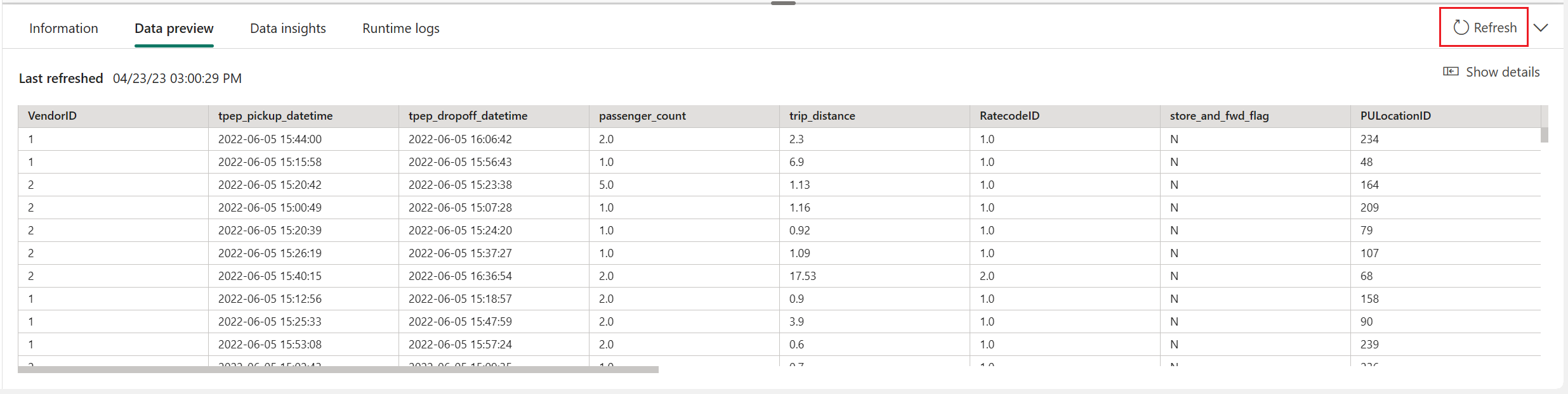 Source data appears on the tab if data is inside the source. For example, the following image shows a preview of sample Yellow Taxi data.