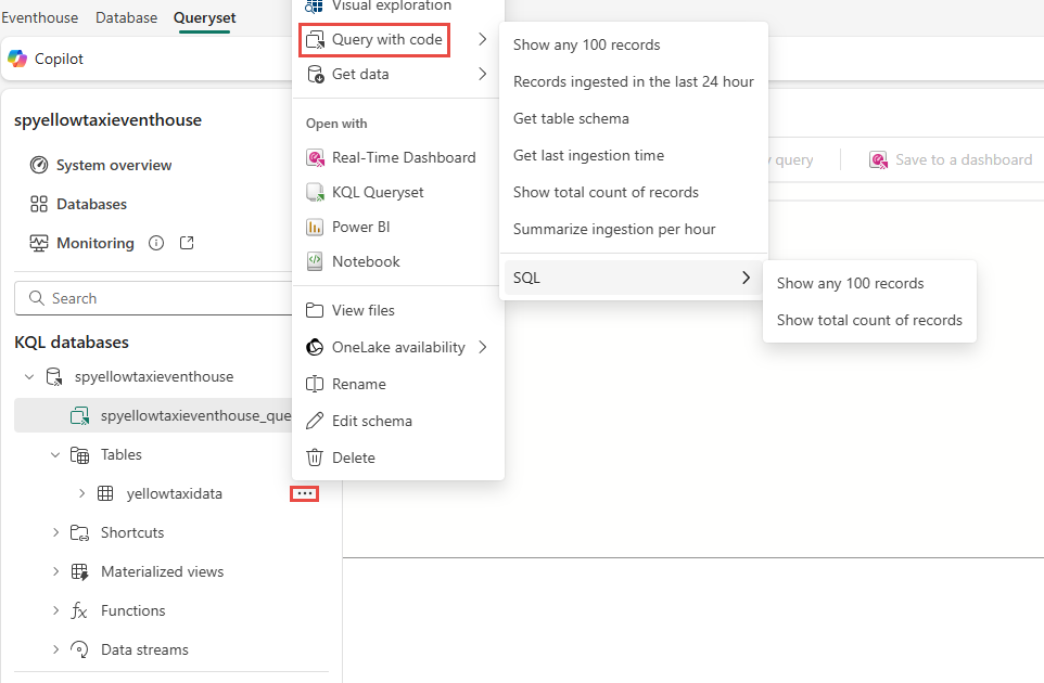 The other way is to hover the mouse over the table, select ... (ellipsis), and you see the following context menu with the same Query with code options.