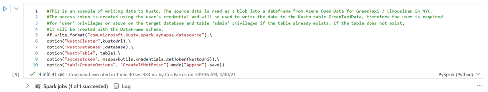 The rest of this workflow occurs in the Data Engineering section of the product, and uses a Spark notebook to load and query data in your KQL database.