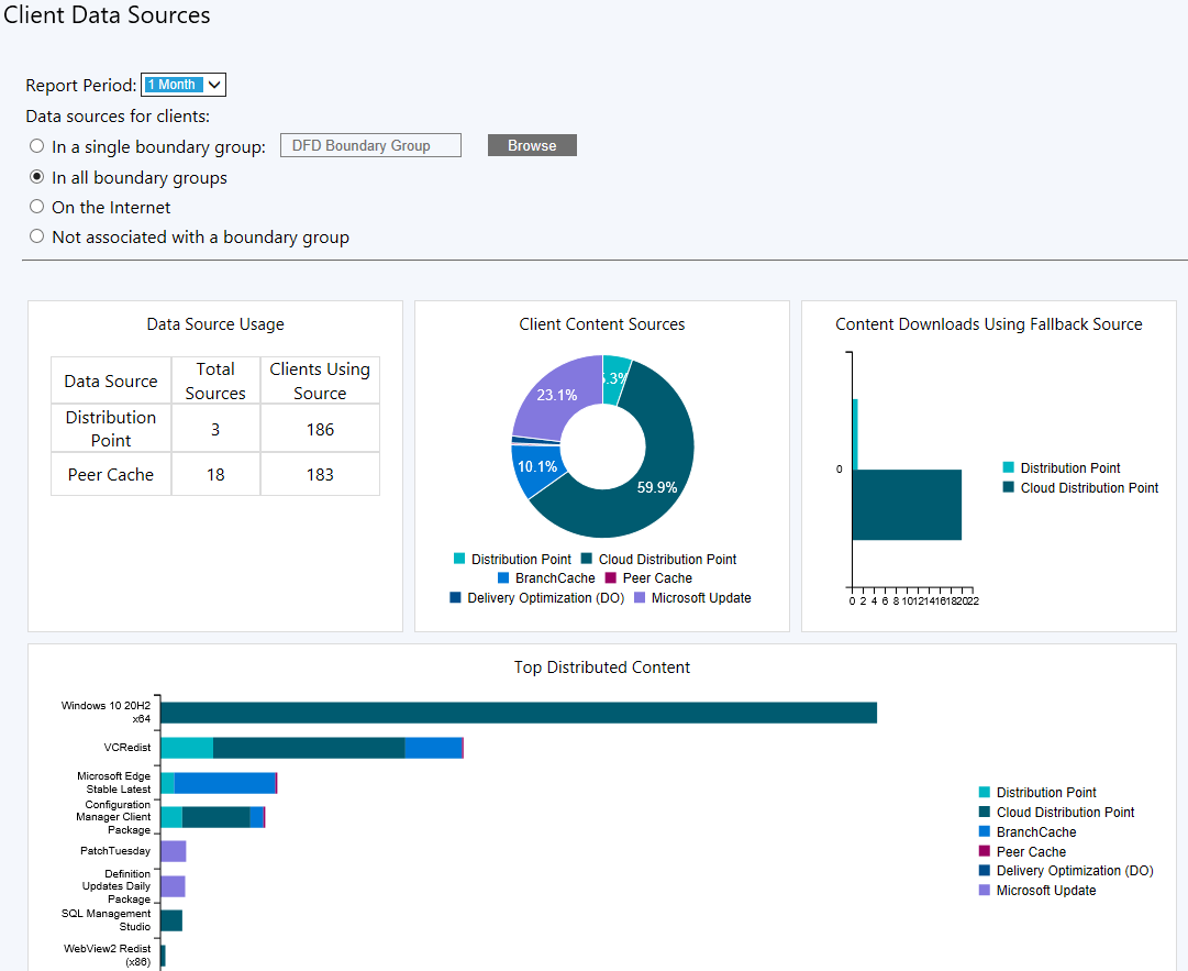 Use the Client data sources dashboard to better understand from where clients get content in your environment. The dashboard starts displaying data after clients download content and report that information back to the site. This process can take up to 24 hours.