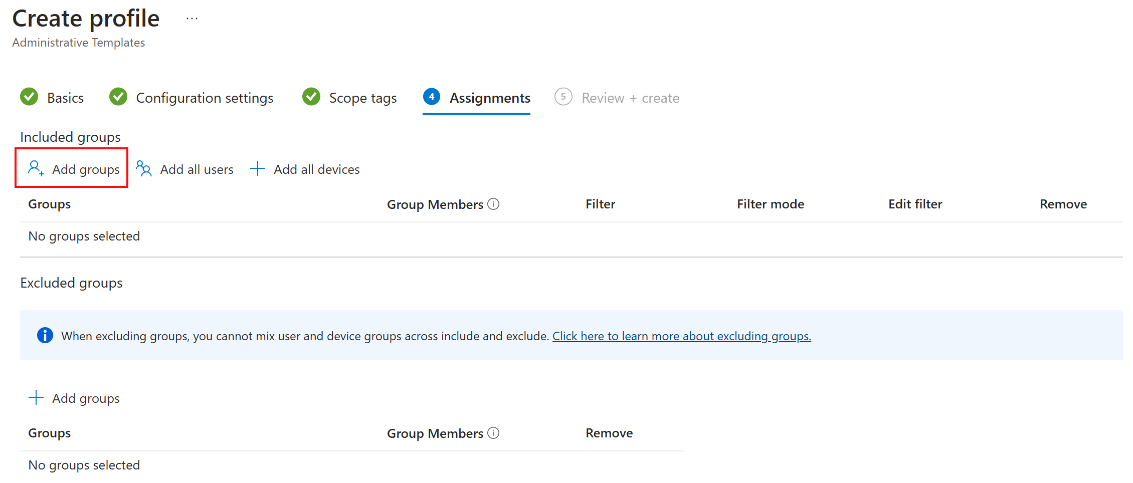 Assignments are optional, and this example doesn't use them. In production, select Add groups. Select a Microsoft Entra group that includes users or devices that should receive this policy. For information and guidance on assigning policies, go to Assign user and device profiles in Intune.