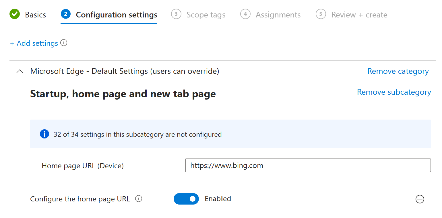 In Configuration settings, select Add settings, and search for Edge: