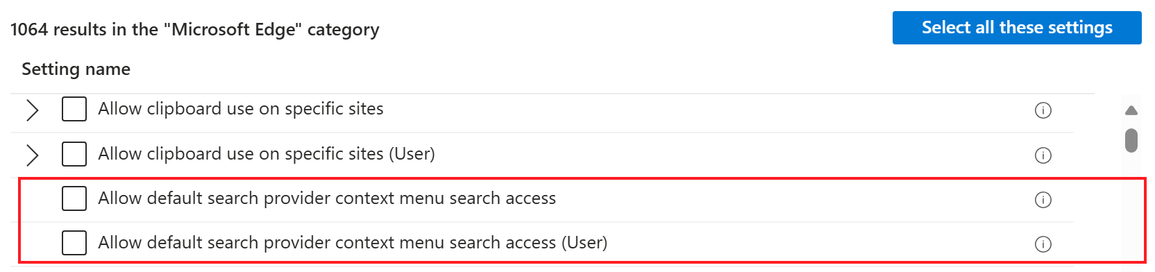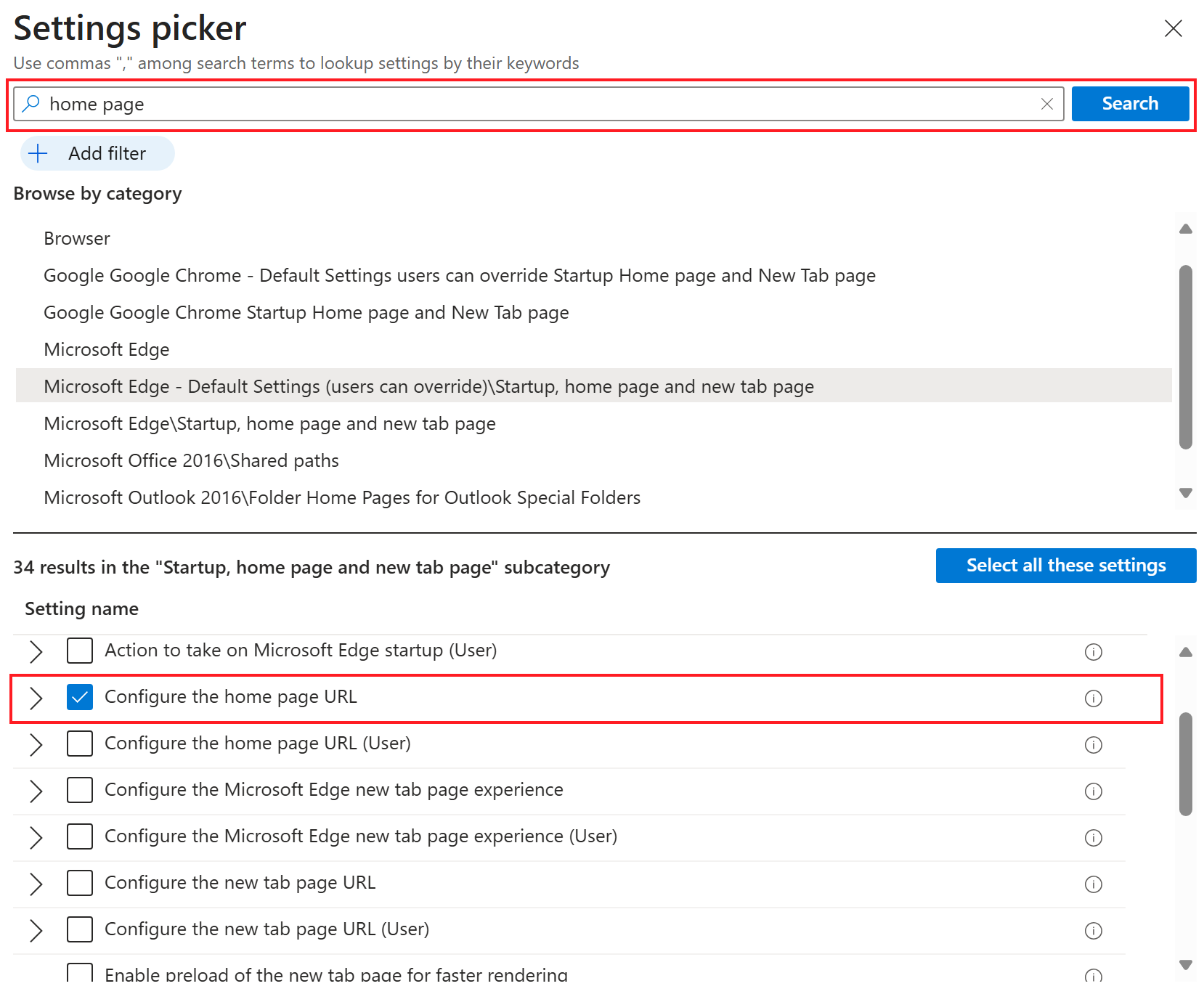 (User)in the name apply to all users signed into the device. The other settings apply to the device, even if no one is signed in.In search, find a specific Microsoft Edge setting you want to configure. For example, search for