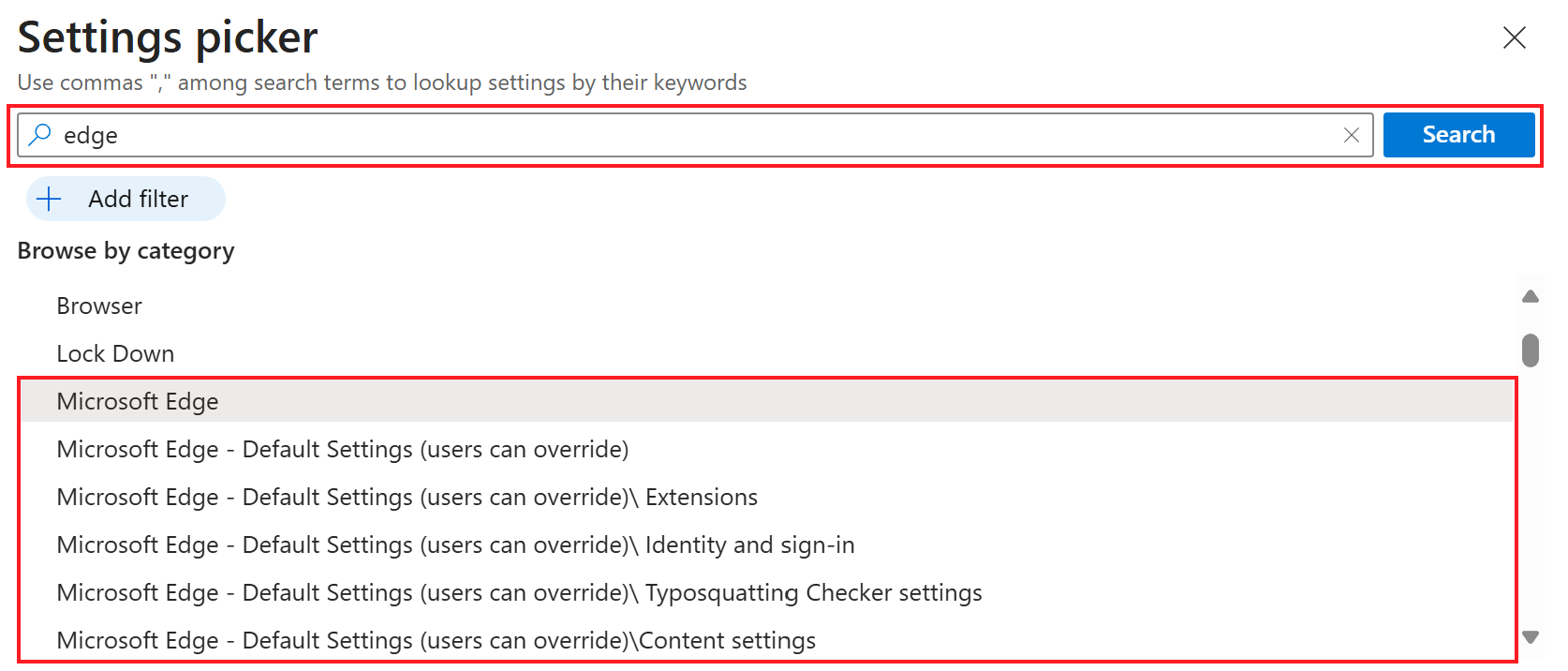 This section shows you how to create, search, and configure Microsoft Edge settings using the settings catalog.