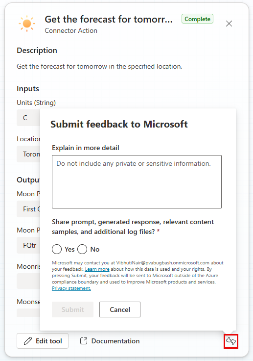 Here, the user asked, "What's the weather going to be like in Toronto, Canada tomorrow?" You can see the action that was selected to respond, and the inputs and outputs.