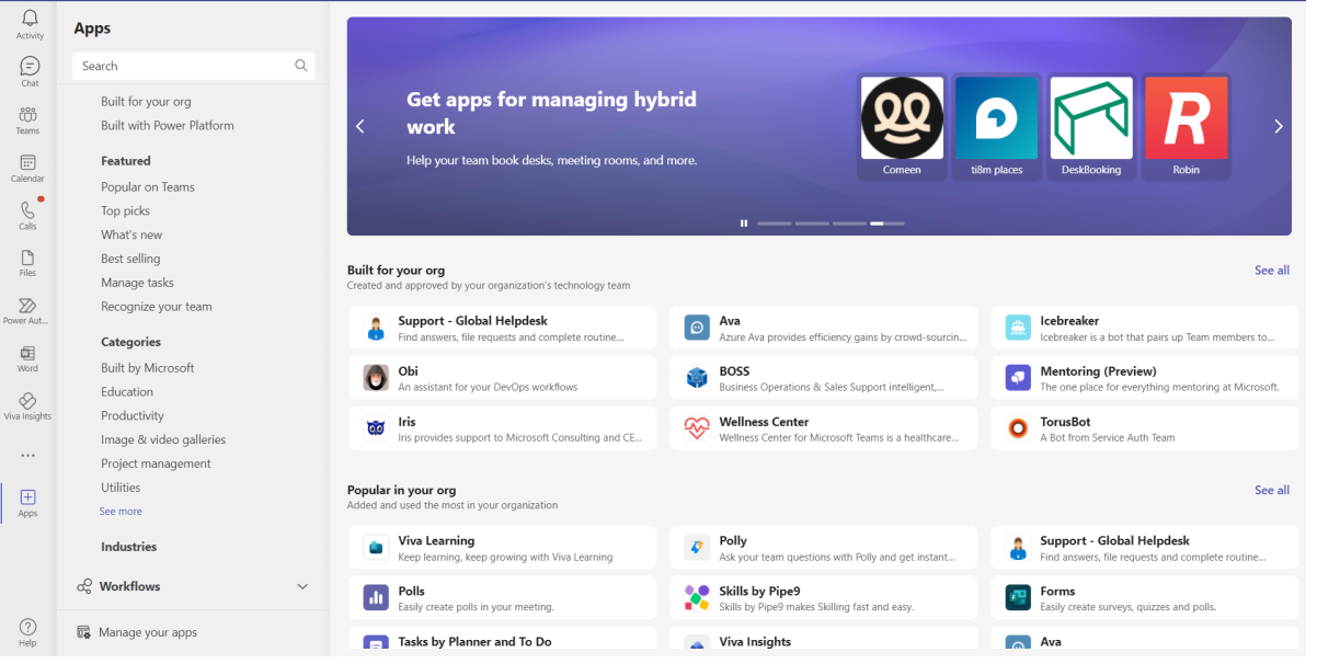 - Browse by apps built for your org and built with Power Platform to discover and install apps in Teams