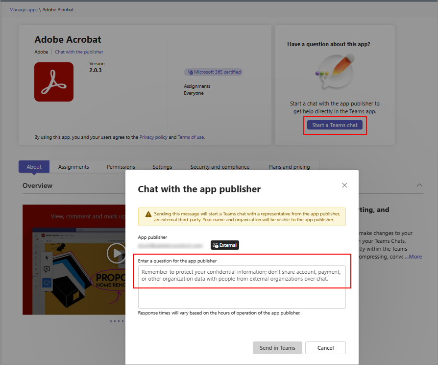App developers can provide their contact information that you can use to chat with them. It helps you quickly evaluate an app and get the needed information from the app developers before you adopt and roll out an app. Examples include compliance information, certifications, data handling practices, pricing details for paid apps, and setup instructions. You can start a chat with app developers by selecting Start a Teams chat but only if the app developer provided their contact information. We recommend that you don't share personal and sensitive information in the chat.