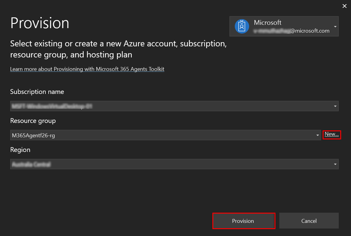 Select Project > Microsoft 365 Agents Toolkit > Provision in the Cloud.