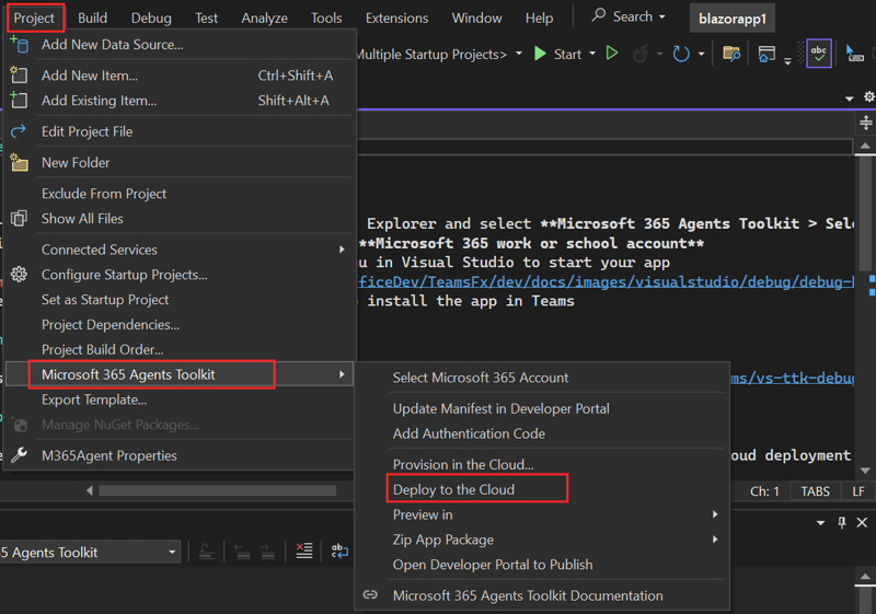 Select Project > Microsoft 365 Agents Toolkit > Deploy to the Cloud.