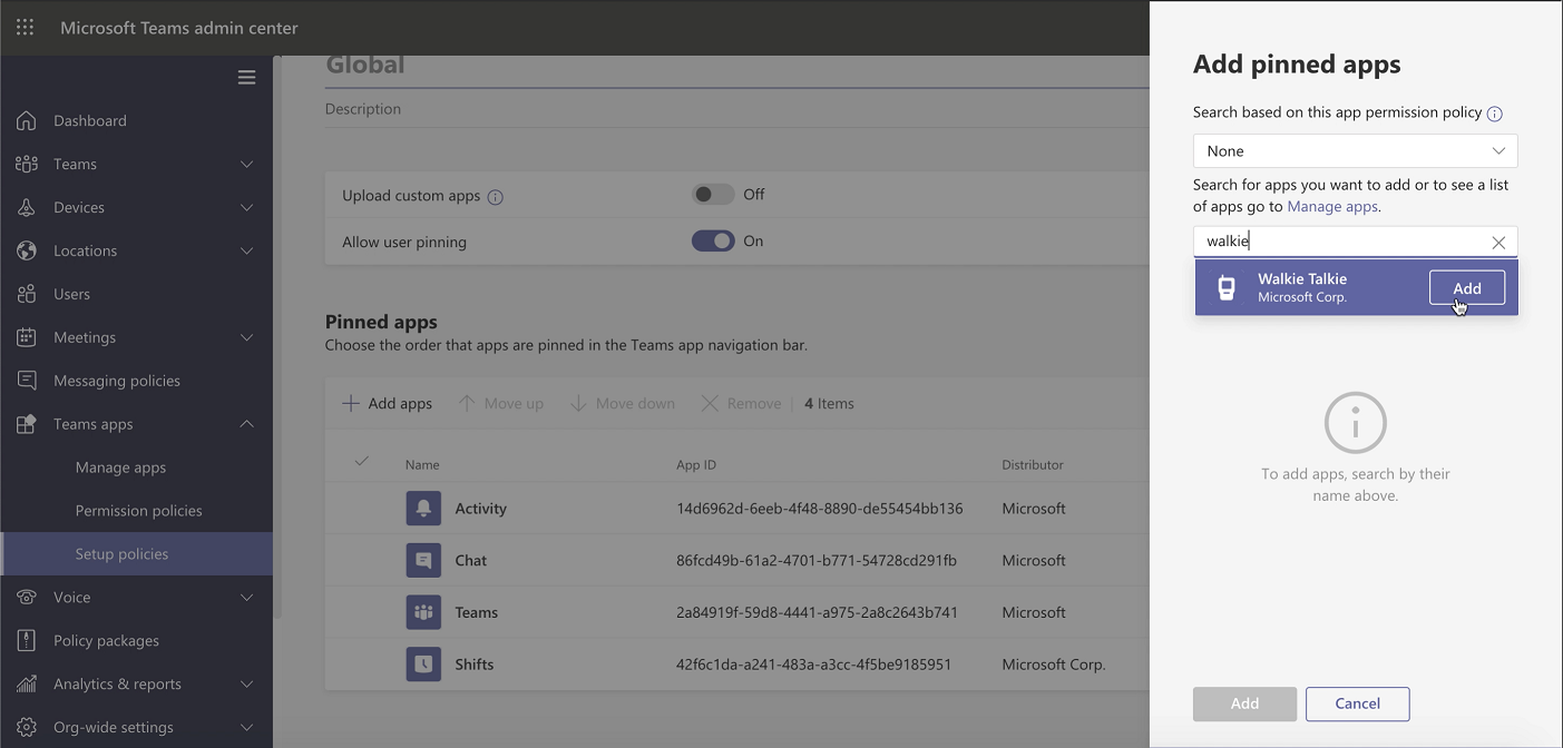 E license: Use an app setup policy to pin Walkie Talkie to Teams