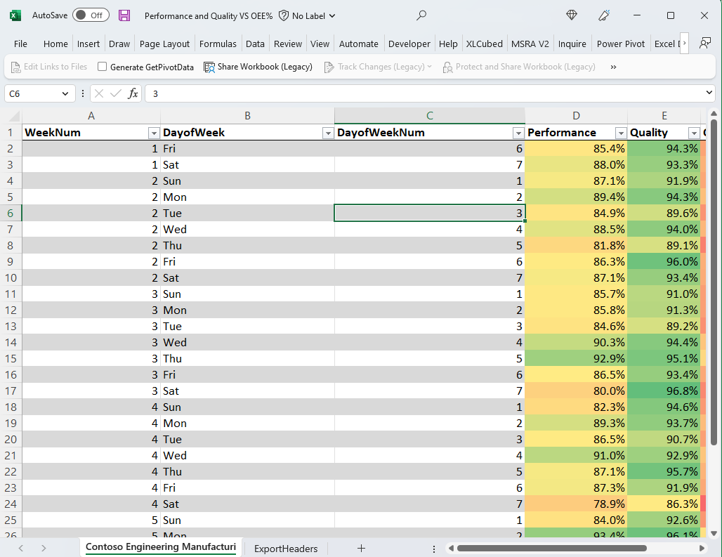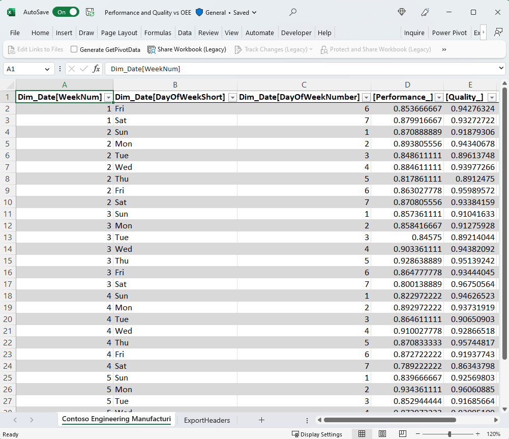 • If you connected via export with live connection, your Excel workbook contains an Excel table.