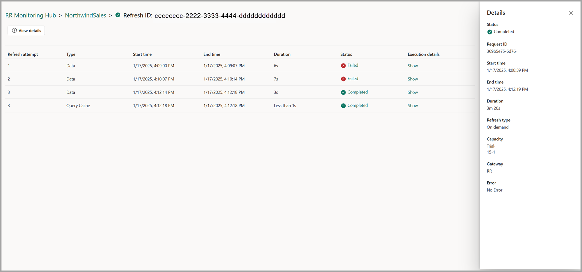 For each refresh attempt, you can view the execution metrics by selecting the Show link in the Execution details column. Execution metrics can assist with troubleshooting or optimizing the semantic model refresh. Previously, this execution metrics data was accessible through Log Analytics or Fabric Workspace Monitoring.