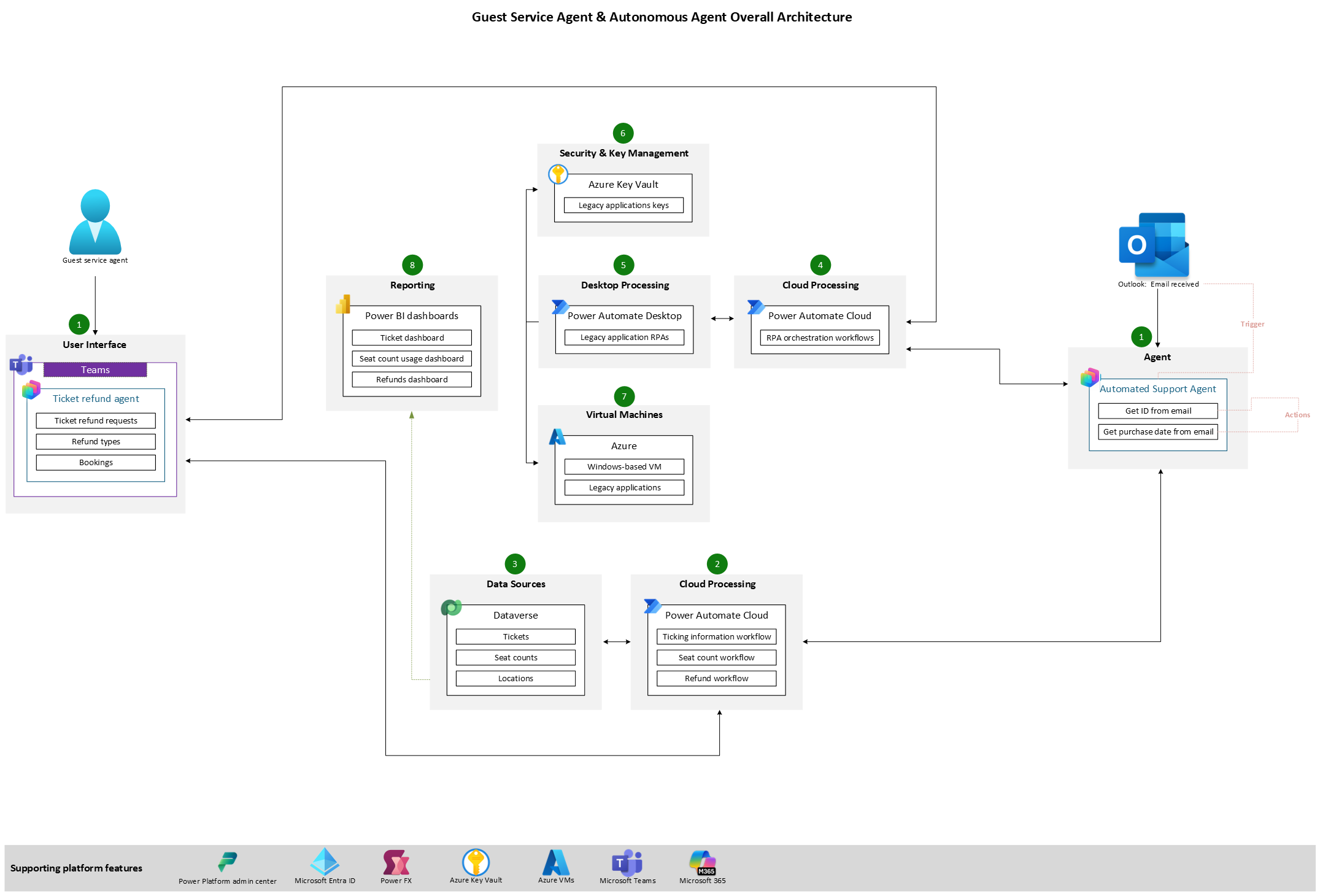 User interface: Microsoft Teams provides easy access for employees to interact with a Copilot Studio agent, integrating with Power Platform for seamless chat support. This integration allows employees to start the ticket refund process directly in Teams through the agent, without accessing the legacy systems themselves. Learn more in Connect and configure an agent for Teams and Microsoft 365.