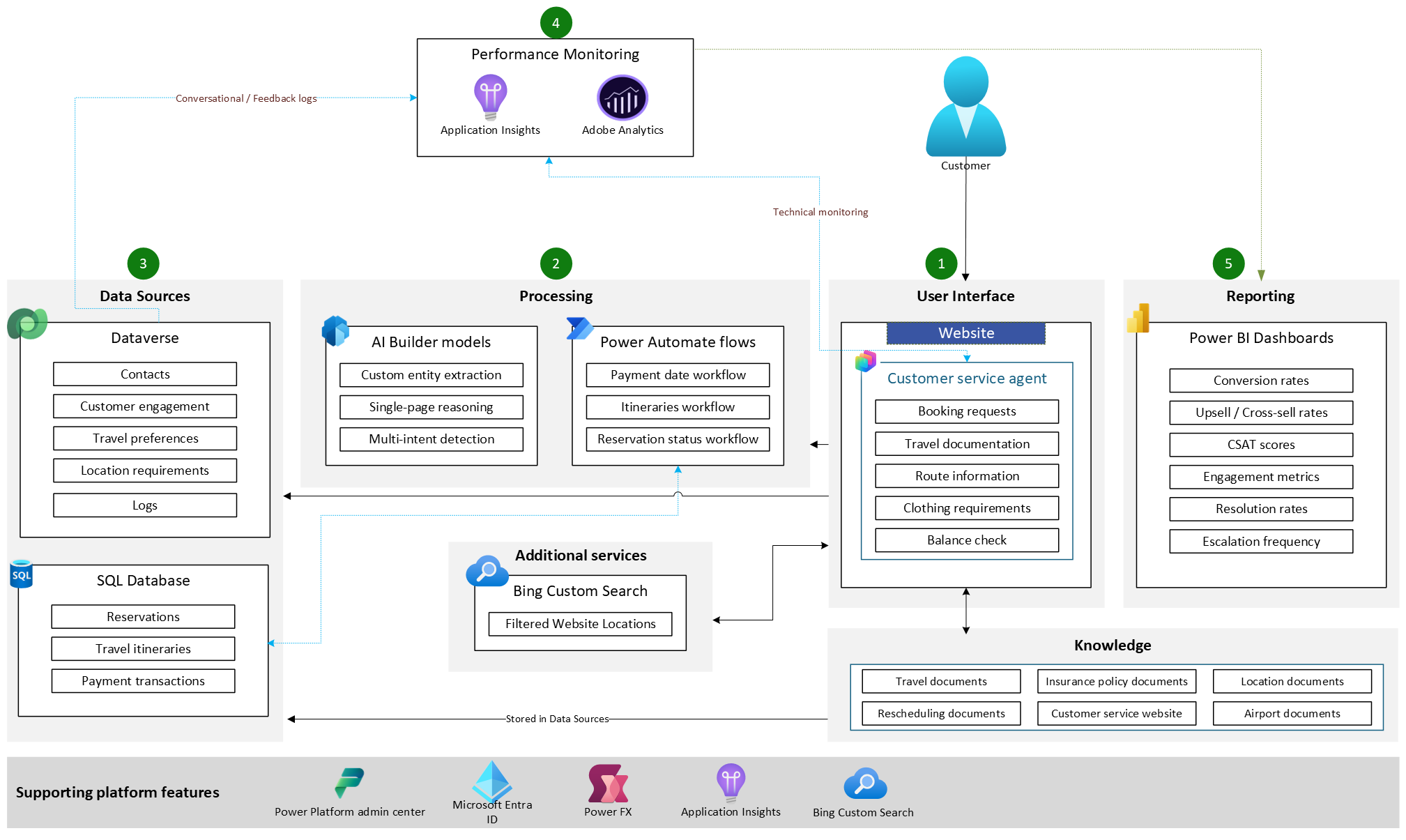 Copilot Studio agent: An AI-driven agent that assists customers with common travel questions, provides in-depth responses, and allows customers to check their reservations and balance owed.