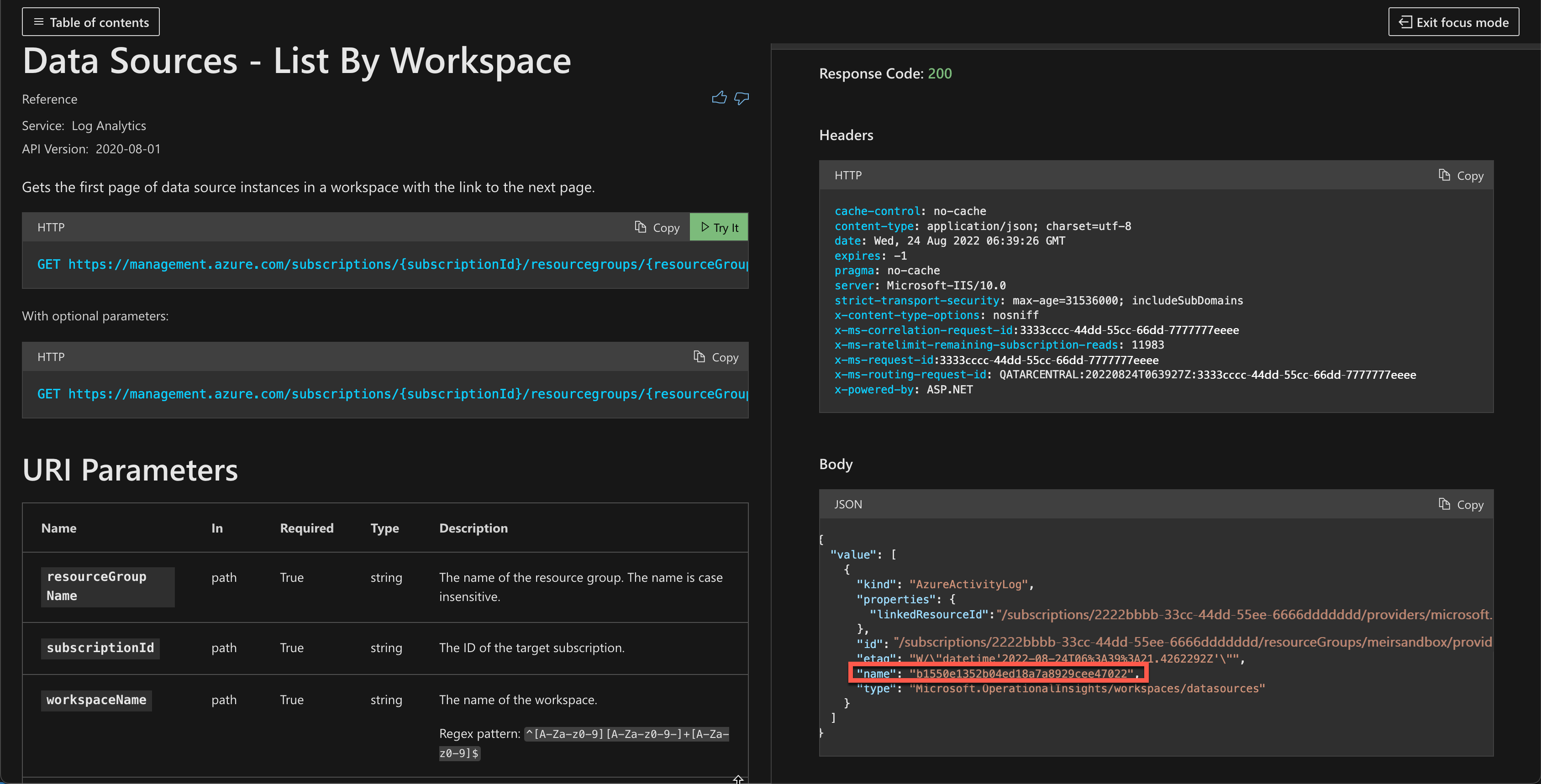 1. List all data sources connected to the workspace using the Data Sources - List By Workspace API and filter for activity logs by setting kind eq 'AzureActivityLog'.