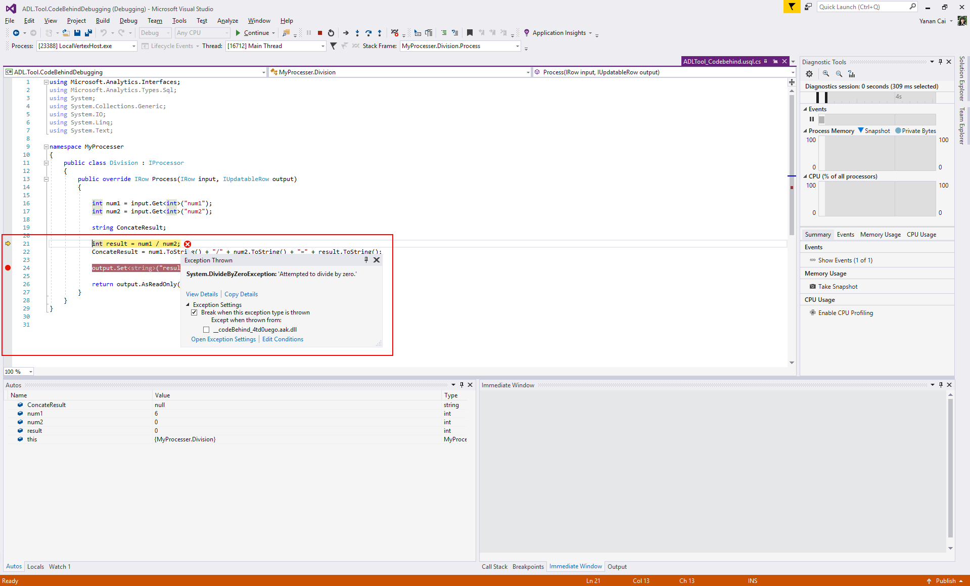 Screenshot of user-defined code with a breakpoint set, showing an exception at the highlighted line.