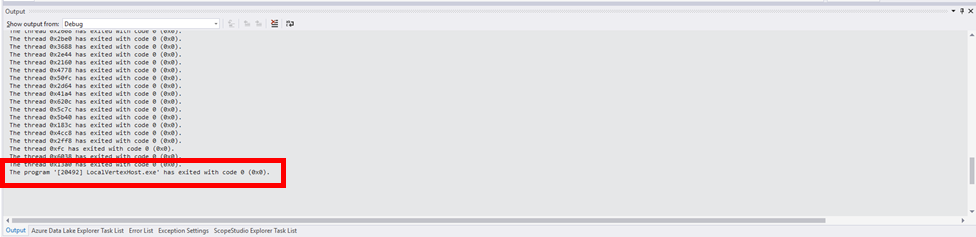 The Program 'LocalVertexHost.exe' has exited with code 0 (0x0).