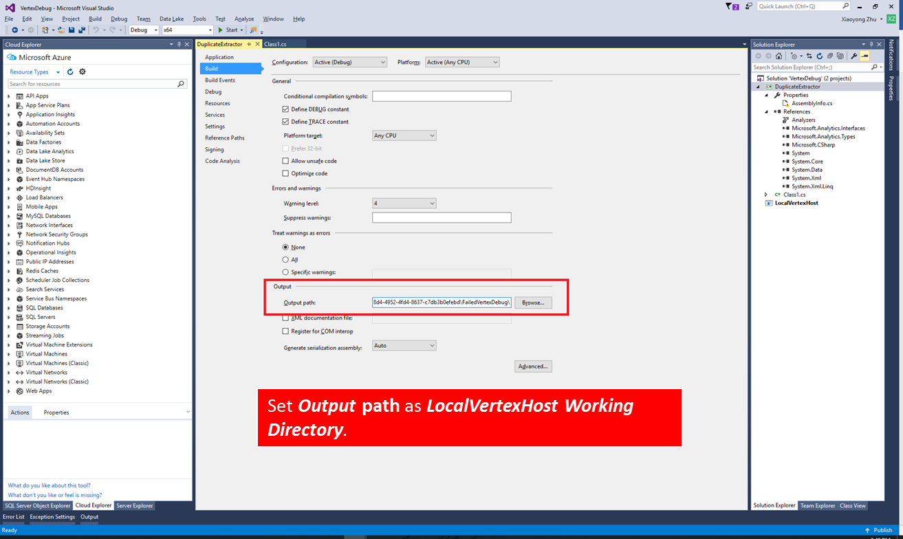 3. Right-Click the added assembly source code project > Properties, select the Build tab at left, and paste the copied path ending with \bin\debug as Output > Output path. The final output path is like <DataLakeTemp path>\fd91dd21-776e-4729-a78b-81ad85a4fba6\loiu0t1y.mfo\FailedVertexDebug\FailedVertexDebugHost\bin\Debug\.