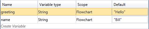 new Variable<string> { Default = "Bill", Name = "name" } },
