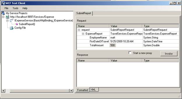 Now the SendReply activity can have the Value set to True to return the indicator of receipt. Obviously, in a more complicated sample, you could use the full power of workflow to save information to the database, do validation of the report, etc. before determining the response. Browsing to the service with the WCFTestClient application shows how the activity configuration defines the exposed service contract as shown in Figure 51.