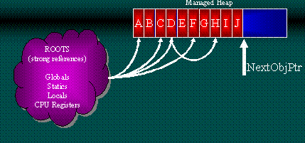 Let's walk through the steps a garbage collector takes during a collection. The GC maintains a list of roots, which point into the GC heap. If an object is live, there is a root to its location in the heap. Objects in the heap can also point to each other. This graph of pointers is what the GC must search through to free up space. The order of events is as follows: