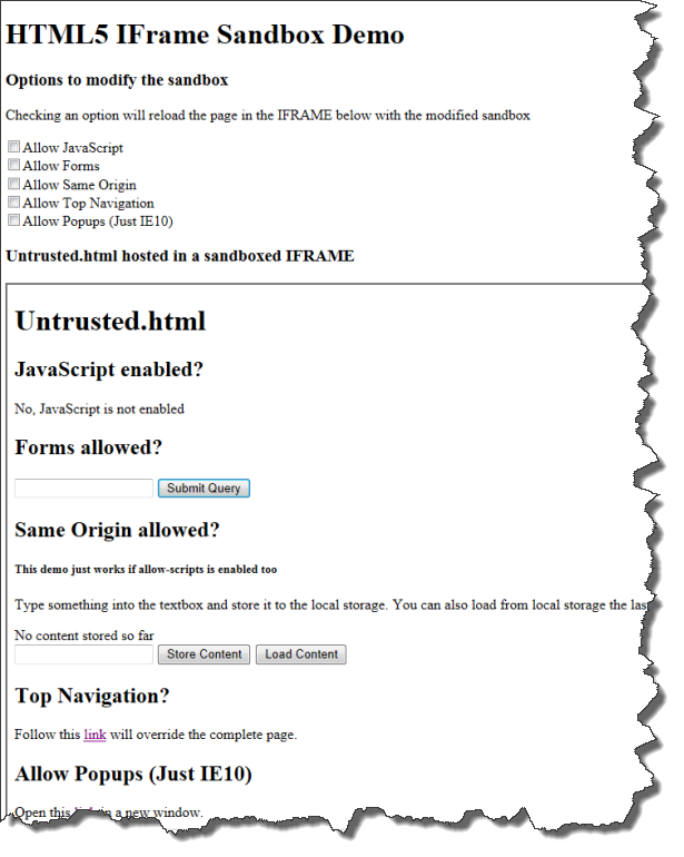Let’s begin by applying the sandbox. Just add it as empty attribute to the IFRAME element: That’s it! Now, IFRAME sandboxed content is re-hosted in the browser with the following restrictions: