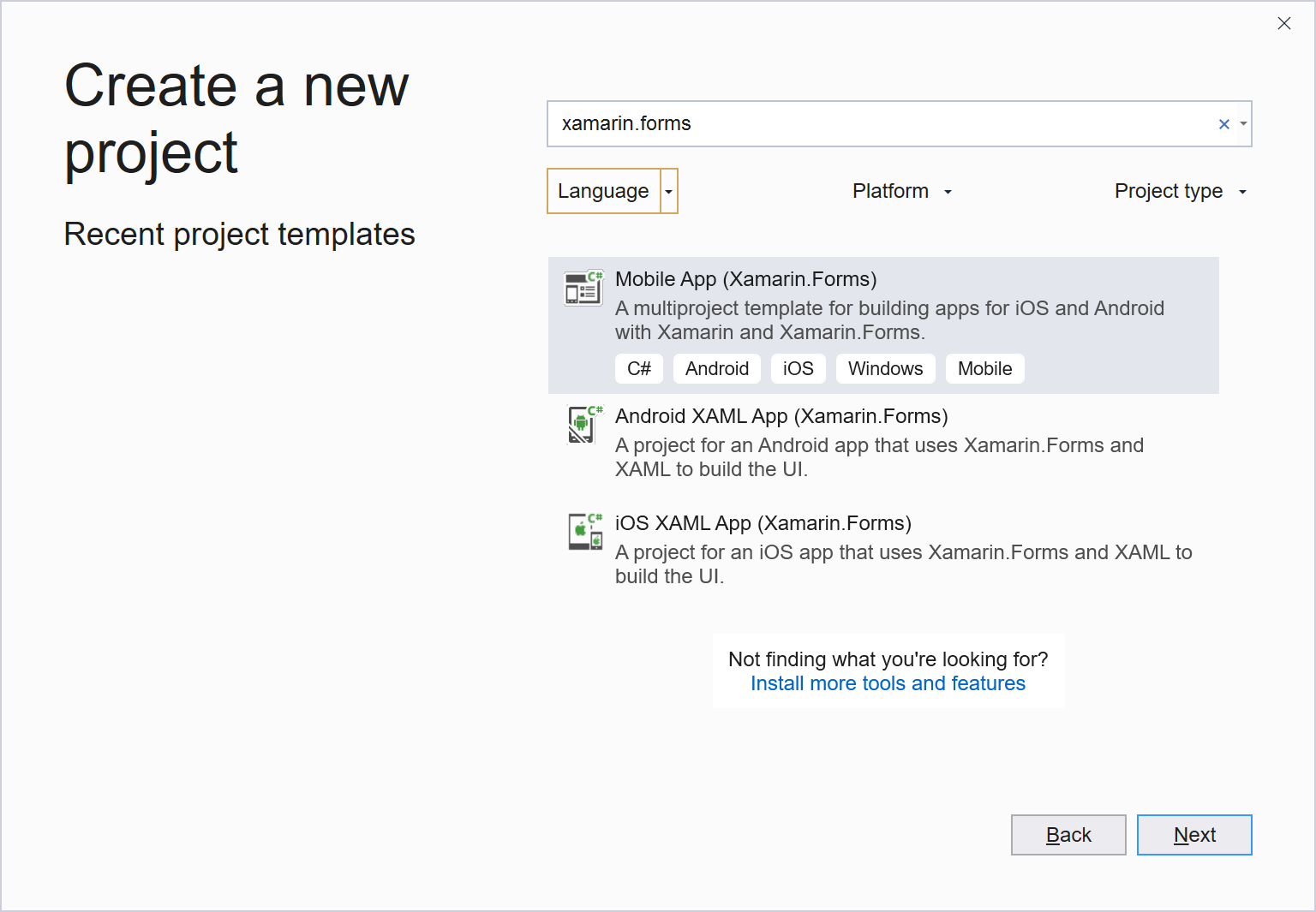 2. In the Create a new project window, type Xamarin.Forms to filter the list and select Mobile App (Xamarin.Forms), then press Next.