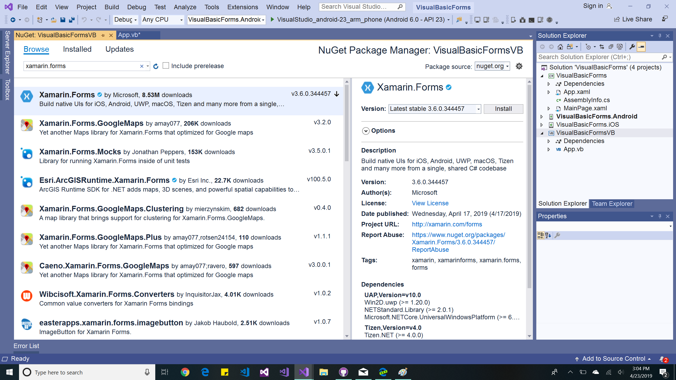9. Right-click on the new Visual Basic project and choose Manage NuGet Packages, then install Xamarin.Forms and close the package manager window.
