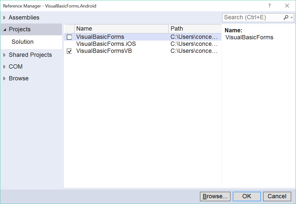 12. Update the Android and iOS projects so that they reference new Visual Basic project (and not the C# project created by the template). Right-click on the References node in the Android and iOS projects to open the Reference Manager. Un-tick the C# library and tick the Visual Basic library (don't forget, do this for both the Android and iOS projects).