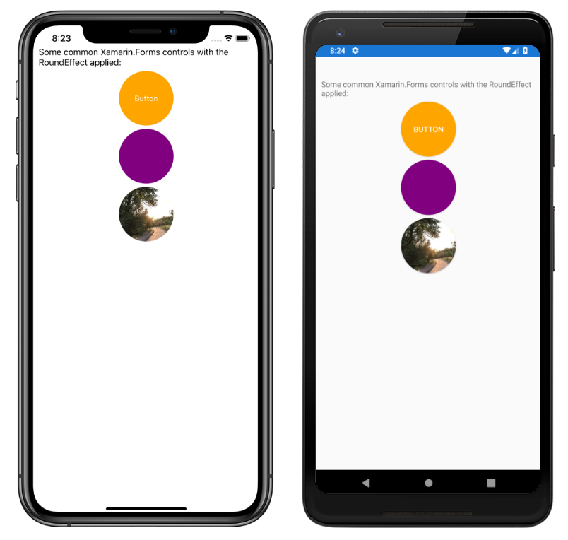 Once the effect is implemented across platforms, it can be consumed by Xamarin.Forms controls. A common application of the RoundEffect is making an Image object circular. The following XAML shows the effect being applied to an Image instance: