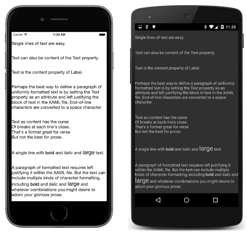 The TextVariations sample contains several examples of setting the Text and FormattedText properties of Label. In XAML, Span objects appear as children of the FormattedString object.