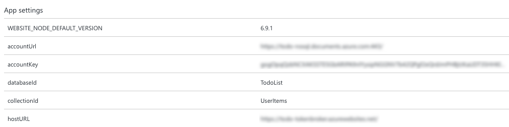 2. In the Azure portal, open the App Settings blade for the web app, and add the following settings: