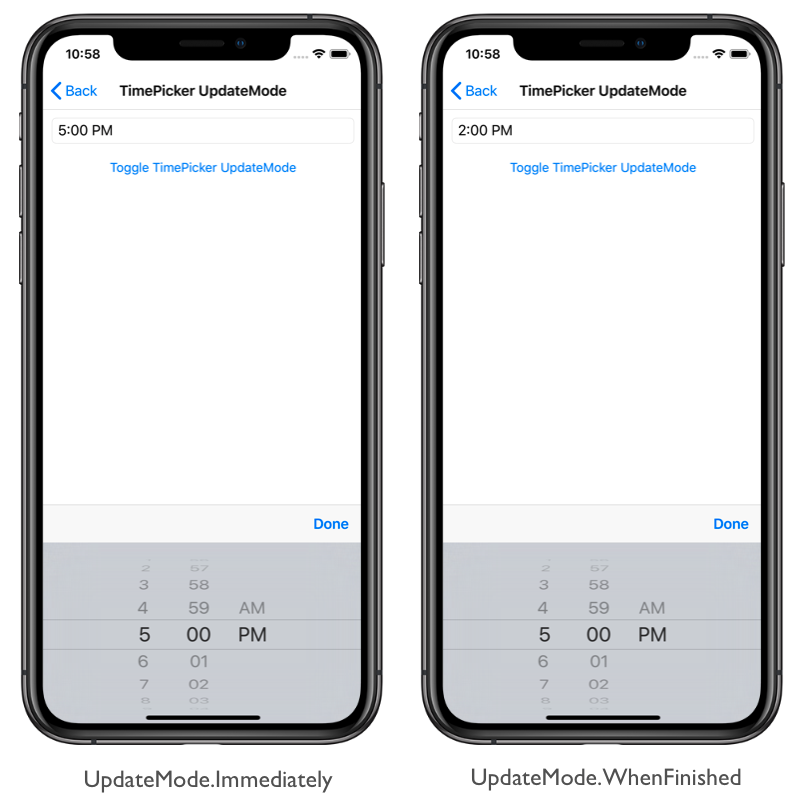 Immediately– item selection occurs as the user browses items in theTimePicker. This is the default behavior in Xamarin.Forms.WhenFinished– item selection only occurs once the user has pressed the Done button in theTimePicker.