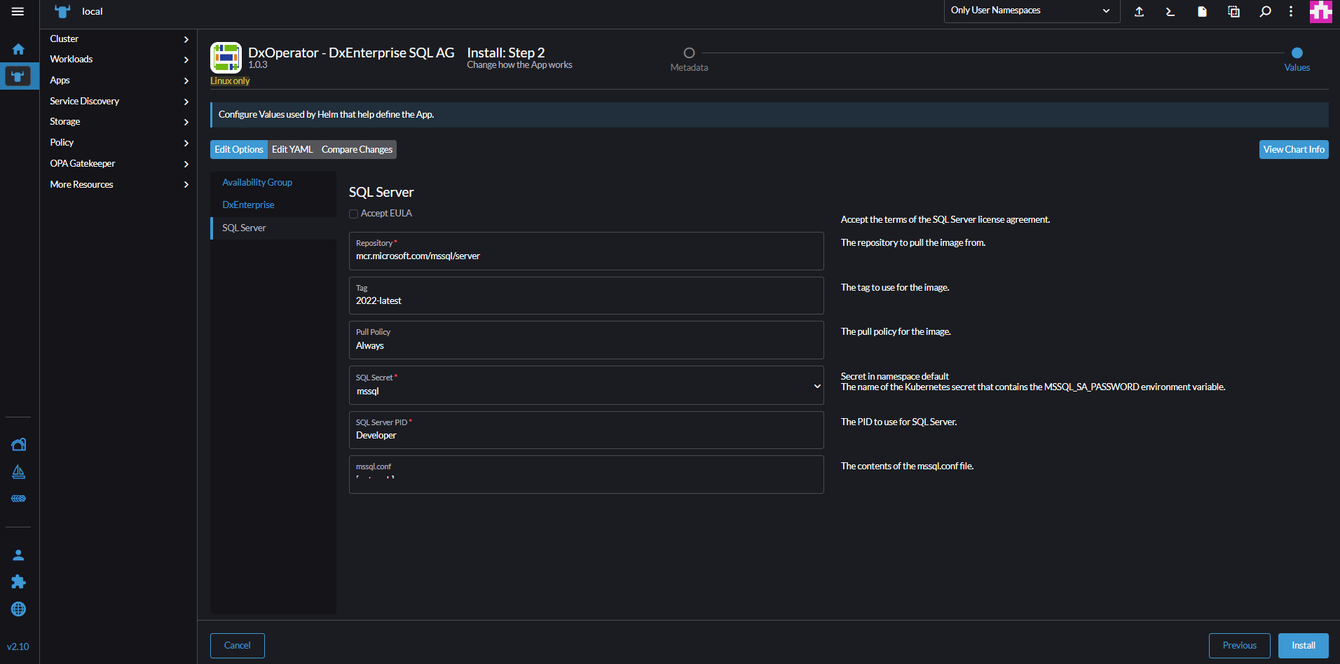DxOperator is a software extension to Kubernetes that uses custom resource definitions to automate the deployment of DxEnterprise clusters. DxEnterprise then provides all of the instrumentation to create, configure, manage, and provide automatic failover for SQL Server AG workloads in Kubernetes. You can register for a free DxEnterprise software license. For more information, see the DxOperator Quick Start Guide. For support issues, contact SUSE directly.
