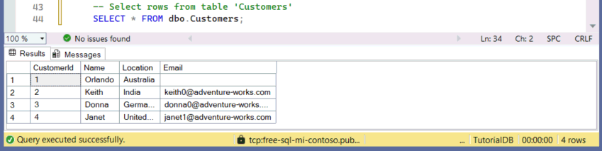 Now let's insert some rows into the Customers table that you created. Paste the following T-SQL code snippet into the query window, and then select Execute: